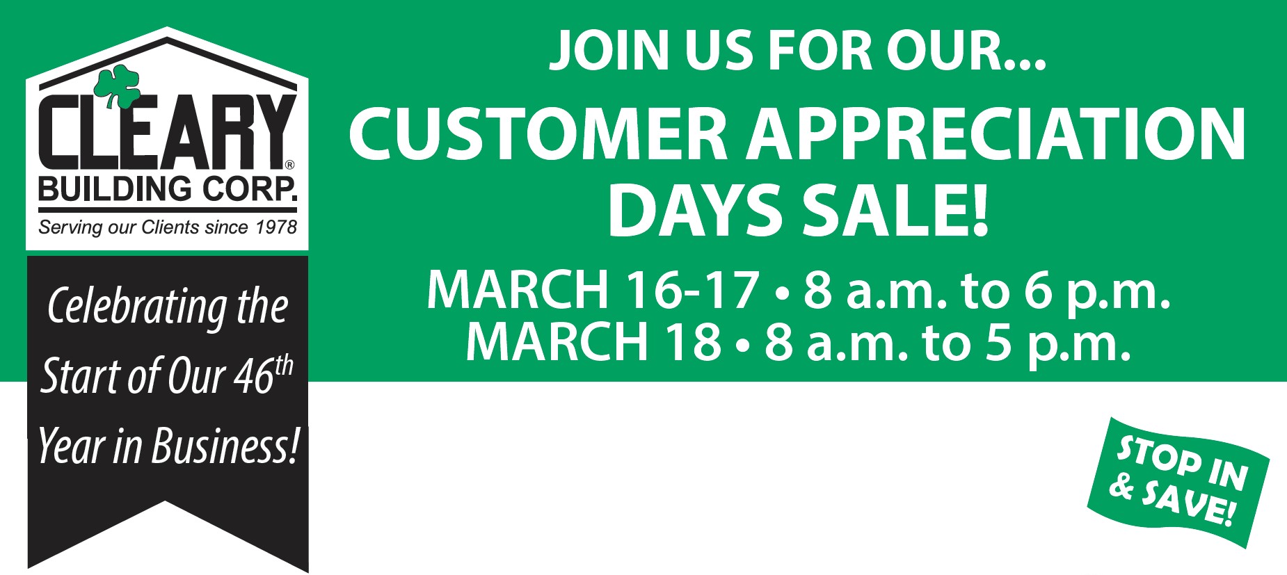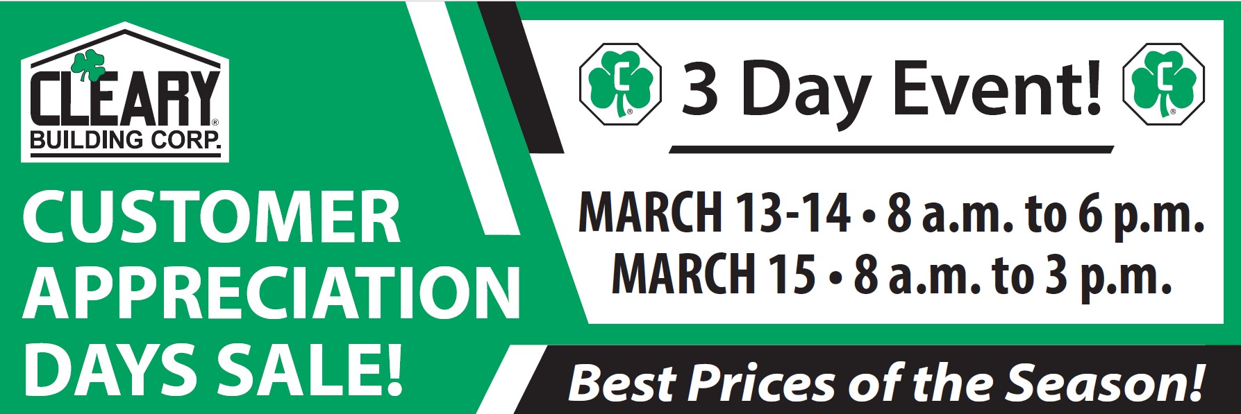 Join Cleary Building Corp. for our Customer Appreciation Days March 13-15, 2025. With 82 branches across the United States, click here to find the location nearest to you. Financing Available!Contact us and get started today! Contact us and get started today!